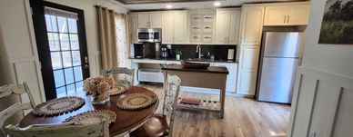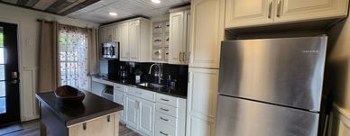 Renovations for the guesthouse cottage is scheduled for the fall of 2025. The Kitchenette is dated but has a full-sized refrigerator and tons of appliances made for cooking on the deck. We provide a, grill, griddle, stove top burners, coffee pot, toaster and toaster oven, microwave, and a crock pot. There is no oven.